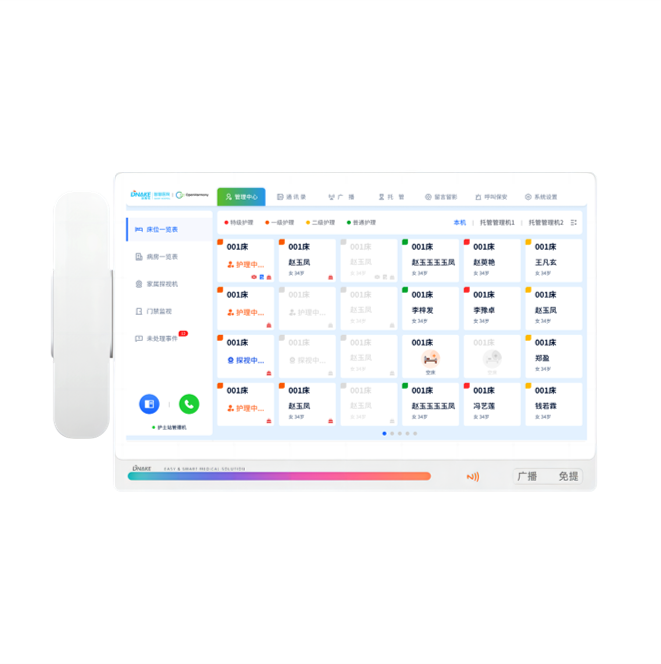 創(chuàng)新設(shè)置在護(hù)士站,可壁掛也可直接放在桌面上。主要接聽(tīng)病區(qū)內(nèi)病床分機(jī)的呼叫以及患者信息查詢(xún)、廣播等基礎(chǔ)應(yīng)用功能,減輕醫(yī)護(hù)人員來(lái)回跑動(dòng)的無(wú)效勞動(dòng)和壓力,及時(shí)響應(yīng)患者需求,并做好醫(yī)護(hù)信息管理。軟件參數(shù):1)采用多點(diǎn)觸控電容顯示屏操作。每個(gè)觸摸按鈕可以顯示整個(gè)病區(qū)下的,所有病人的名字、性別、護(hù)理等級(jí),點(diǎn)擊格子后,可顯示每張病床患者更具體的患者信息。2)基于TCP/IP網(wǎng)