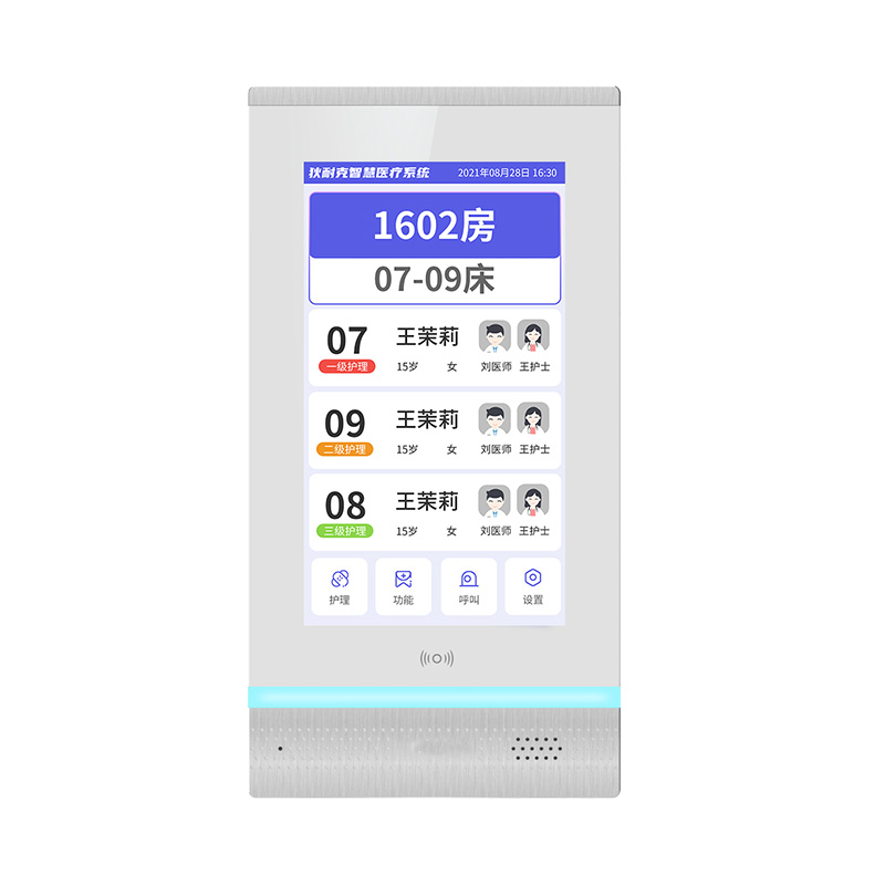 設置在病房門口的終端設備,主要用于顯示病房相關信息,內置簡易醫(yī)護工作站,支持病房床位一覽、患者動態(tài)跟蹤、呼叫對講、增援求救等多種呼叫類型,信息齊全,及時響應醫(yī)護需求,實現(xiàn)智能化醫(yī)護管理。