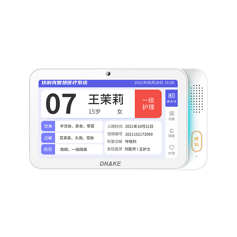 安裝在病床頭的交互設(shè)備機,代替?zhèn)鹘y(tǒng)紙質(zhì)卡。產(chǎn)品支持呼叫對講、為住院患者提供病例查詢、狀態(tài)自動提醒等護理需求等。