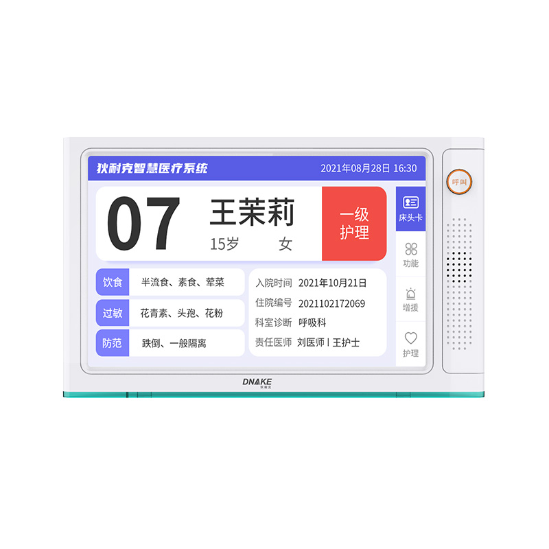 安裝在病床頭的交互設(shè)備機(jī),代替?zhèn)鹘y(tǒng)紙質(zhì)卡。產(chǎn)品支持呼叫對講、為住院患者提供病例查詢、狀態(tài)自動(dòng)提醒等護(hù)理需求等。