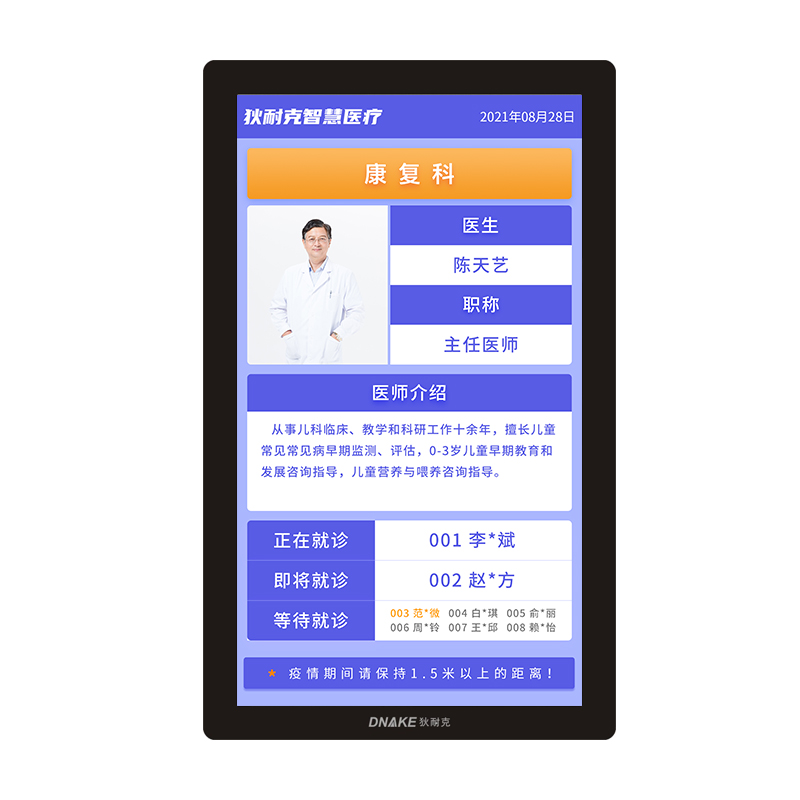 每個診室部署一臺液晶顯示終端,顯示出診專家(出診專科、健康宣教等)信息,診室叫號時全屏(或分屏)顯示需就診患者信息。